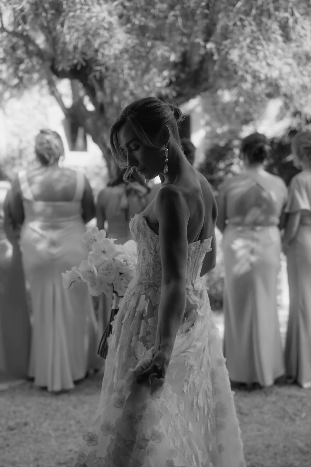 And the cherry on top of the cake? “The flower appliqué”, states Daisy. “It was so uniquely hand-sewn and a real mix of ethereal and sexy, with the boned bodice. As our wedding was in Ibiza, it felt perfect to match the venue and vibe of the island. It also had some tiny crystals sewn on, as if a handful had been thrown at it, which glistened in the sun without it looking too much.”